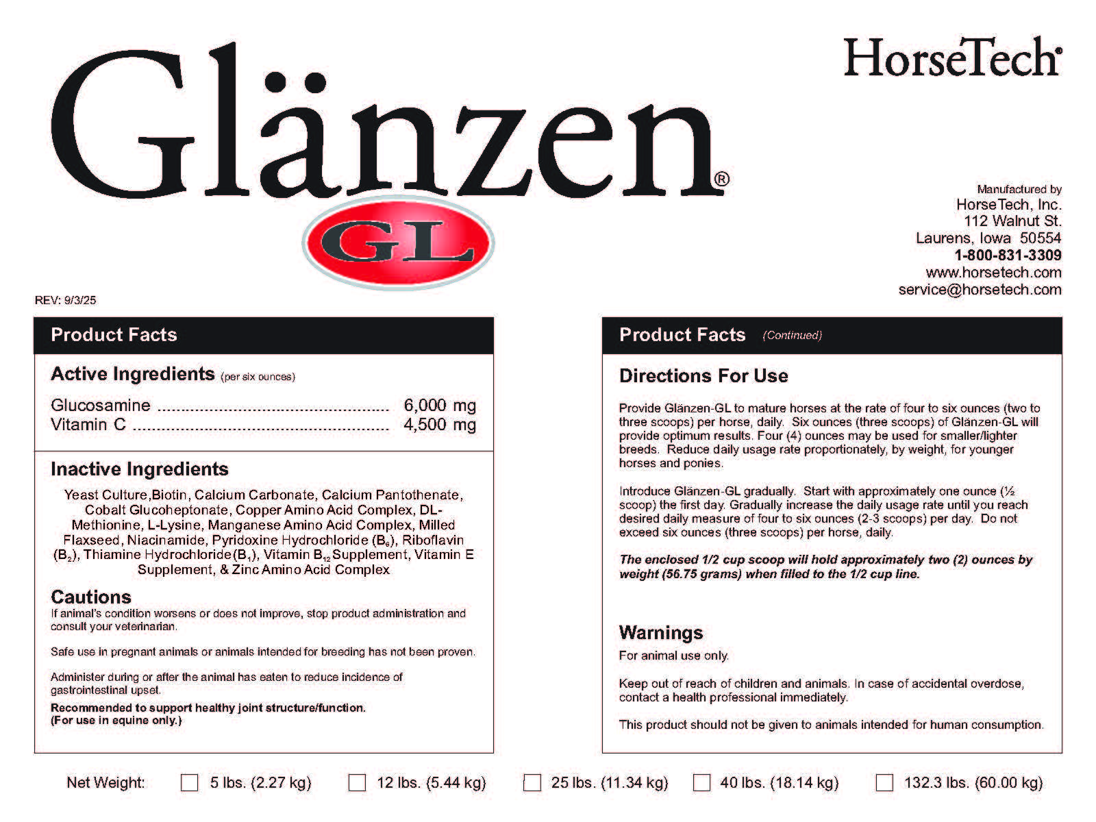 Our ultra-popular Glänzen 3 with added Glucosamine and Vitamin C! Each six ounce serving adds 6,000 mg of ultra-pure Glucosamine HCL and 4,500 mg of Vitamin C to the ingredients found in a six ounce serving of our Original Glänzen 3. All the goodies--30 mg of biotin, 24 grams of natural Omega-3, Zinpro brand performance minerals (Zinc, Copper, Manganese and Cobalt), Methionine, Lysine, our famous B-Plex b-complex vitamin package, and more... Previously selected as a Horse Journal Best Buy and Product of the Year! Your satisfaction is fully guaranteed!