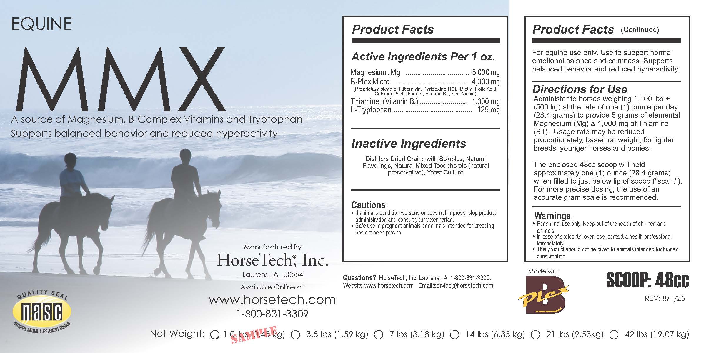 Each one ounce serving of HorseTech's MMX will provide 5 grams of Magnesium from Magnesium Oxide, 125 mg of Tryptophan and a full 1,000 mg of Thiamine (Vitamin B1). In addition, the product provides a full complement of B-complex vitamins. In addition to the previously mentioned Thiamine (B1), MMX provides Folic Acid, b-Pantothenic Acid, Vitamin B12, Niacin, Riboflavin, Pyridoxine (B6) and Biotin. Made with a tasty base of yeast culture and distillers grains.